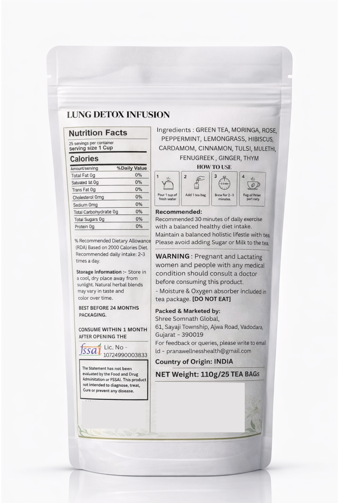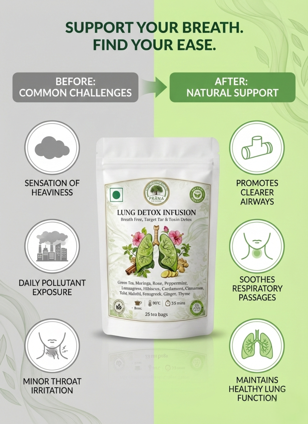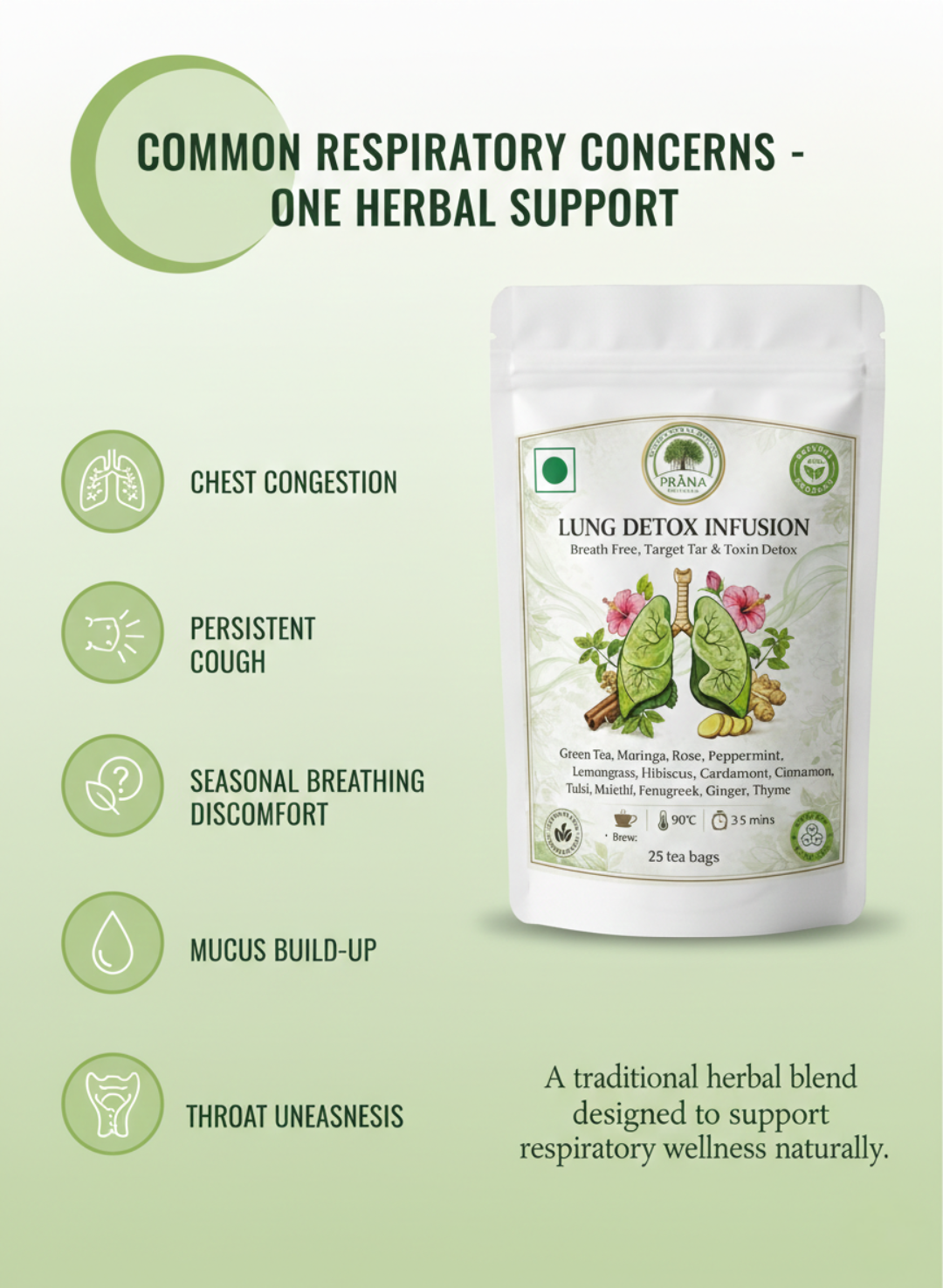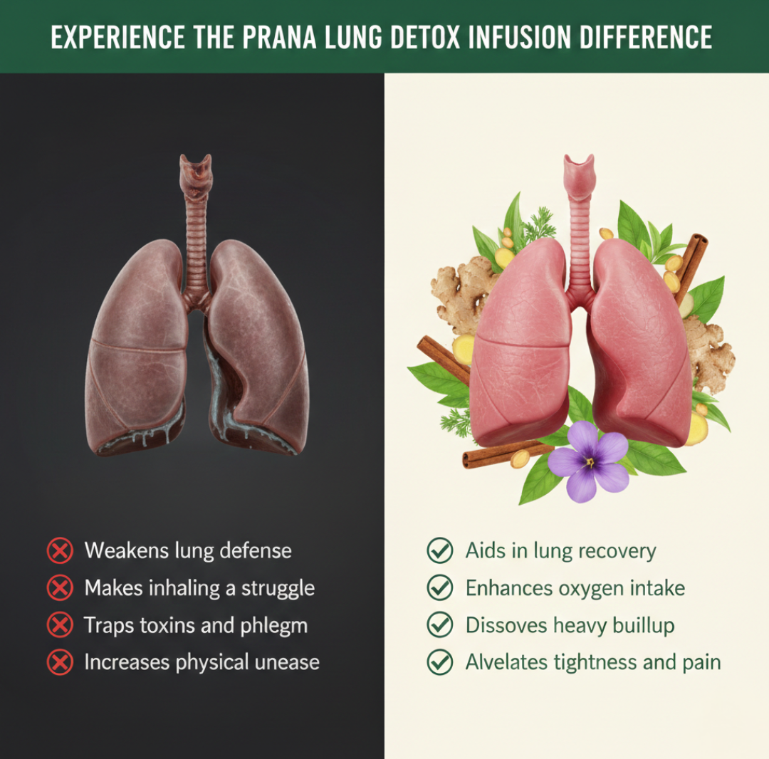 Experience the power of nature with Prana Lung Detox Infusion, a masterfully crafted herbal blend designed for the modern world. In an age of urban pollution and environmental stressors, your respiratory system deserves proactive care. Our infusion combines 13 time-tested Ayurvedic botanicals to help you find your natural breath and vitality. This unique blend features potent ingredients like Mulethi (Licorice Root) and Tulsi, traditionally used to soothe the throat and support lung health. The inclusion of Moringa and Green Tea provides a rich source of antioxidants, while Ginger and Thyme work in harmony to assist in maintaining clear airways. Whether you are navigating a smoke-prone environment or simply seeking to support your body’s natural defenses against tar and toxins, this caffeine-free infusion offers a refreshing, aromatic path to wellness.